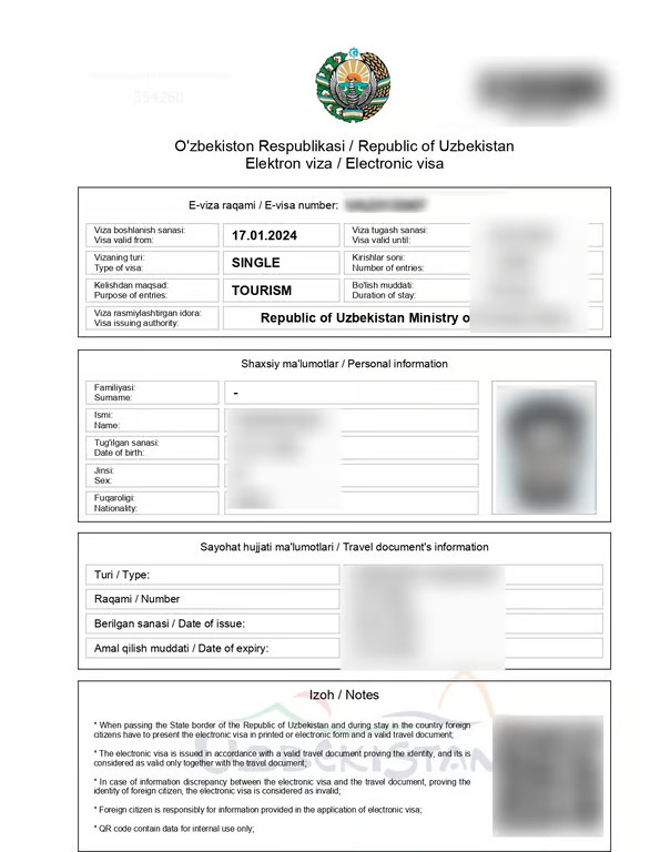 – Electronic Visa (E-visa): Applied online at www.e-visa.gov.uz (for citizens of over 77 countries) for up to 30 days; single, double, or multiple entry.